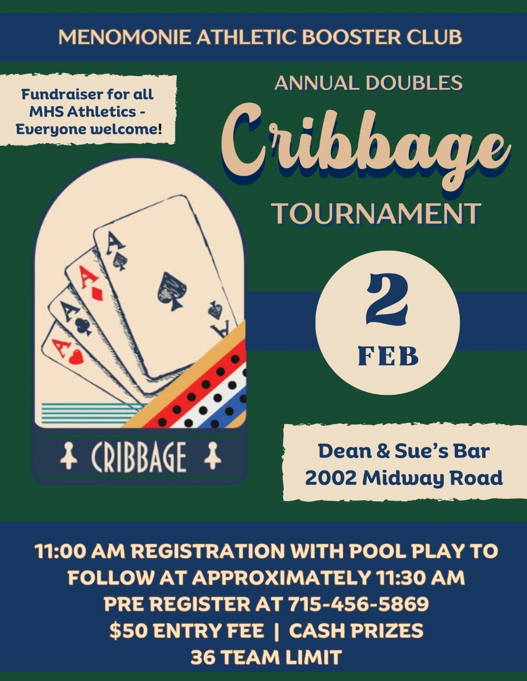 A friendly Doubles Cribbage Tournament in Menomonie on Sunday Feb 2. Cash prizes and many door prizes. This is a fundraiser for the Menomonie Area Booster Club. $50/team. Registration is from 11:00-11:30 at Dean & Sue’s. Call or text 715-456-5869 to pre-register.